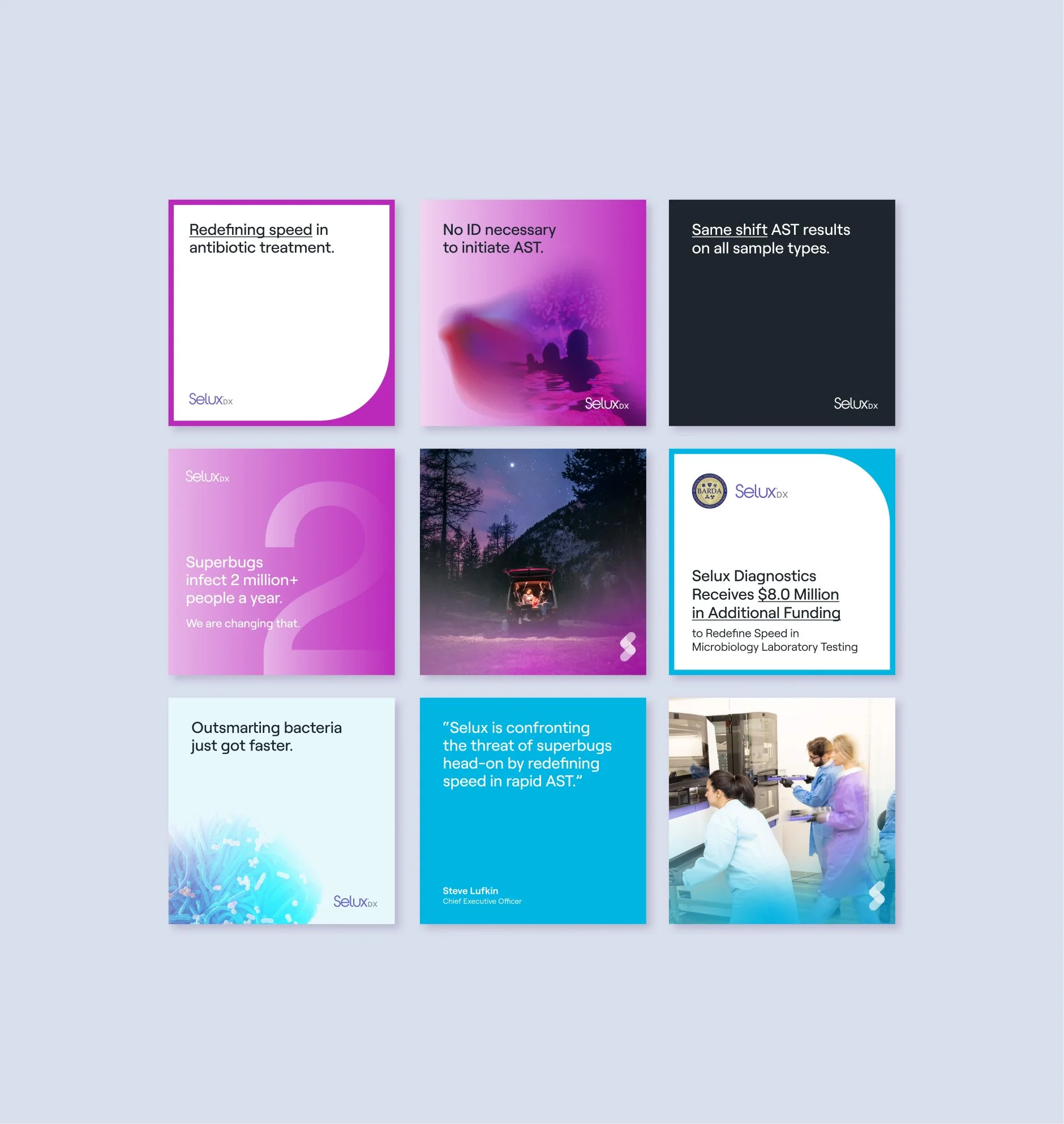 We developed a comprehensive suite of marketing collateral to visually showcase Selux Diagnostics' proprietary products and scientific processes. Working closely with regulatory, legal, and creative teams, we ensured compliance while creating a clear, standout brand.